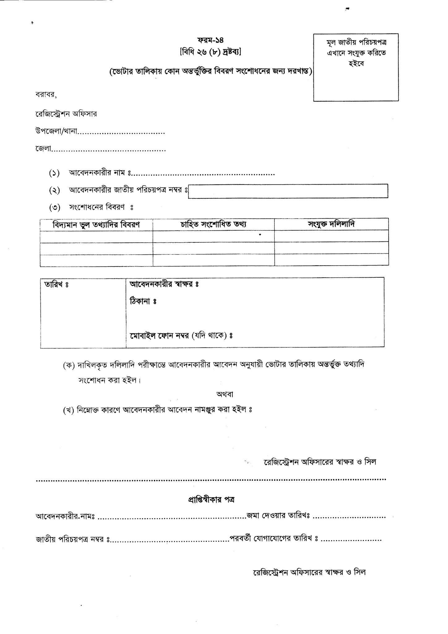 ×××ভোটার তালিকা হালনাগাদ-২০২৫ এ নিবন্ধিত ভোটারদের কারো কোনো তথ্যে ভুল থাকলে, তারা আগামী ১০ আগস্ট, ২০২৫ তারিখ হতে ২১ আগস্ট, ২০২৫ তারিখ পর্যন্ত ফ্রি সংশোধনের সুযোগ পাবেন। ×××এই সংশোধন করার জন্য সংস্লিষ্ট উপজেলা নির্বাচন অফিসে ফরম-১৪ তে আবেদন করতে হবে। আবেদ
